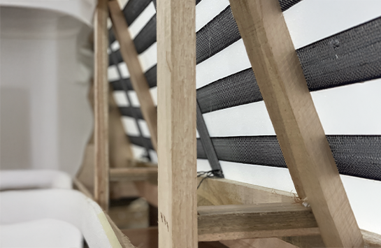 Todas as peças são produzidas com madeira de eucalipto renovável, tecidos selecionados, espumas de alta densidade e percintas elásticas, com aplicação manual em diversas etapas.